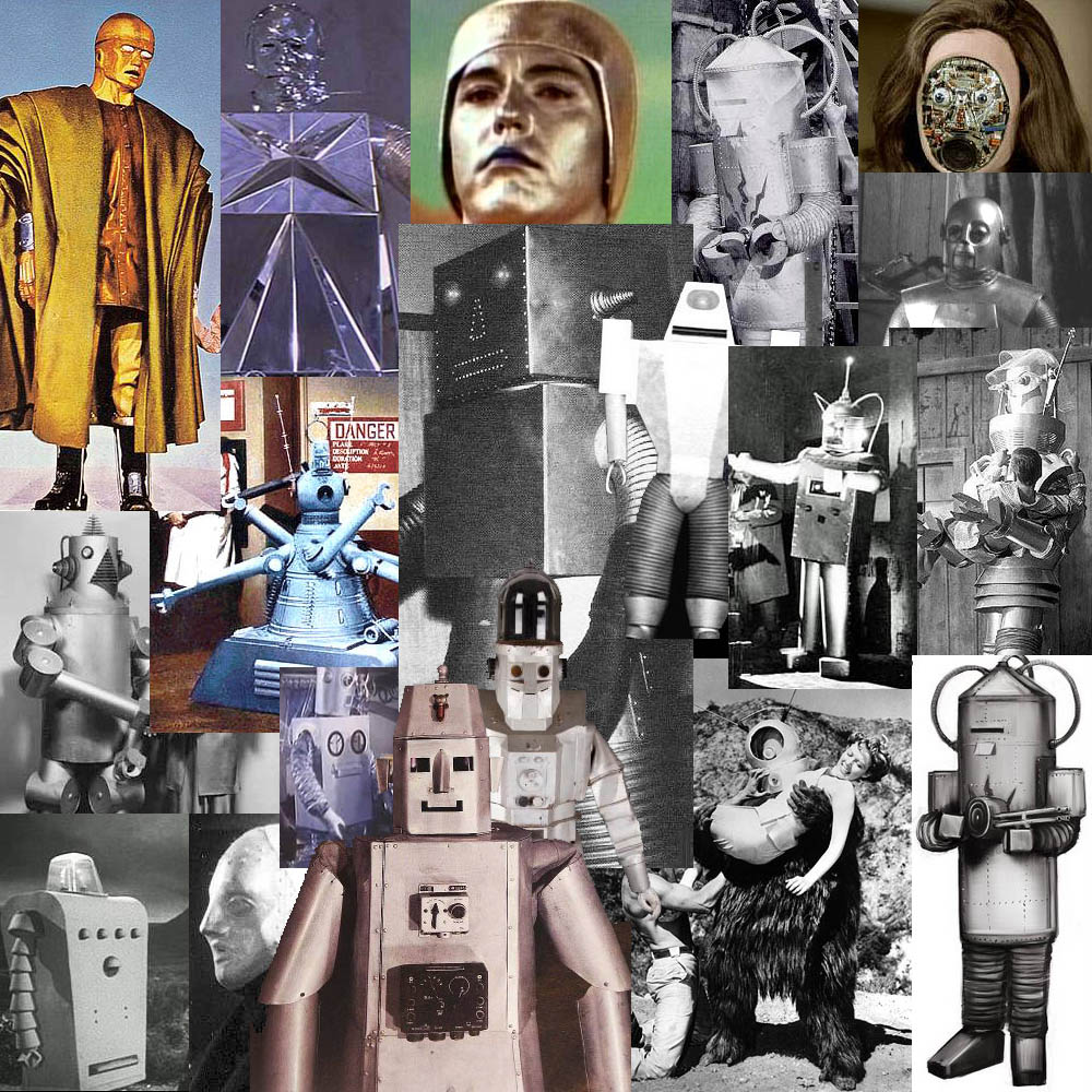 However these really are the exceptions. Mostly robots looked like silver boxes with tubes for arms and legs in feature films, and especially on TV in the sixties with its lower budget, robots were people in odd clothes with silver painted faces or metal heads.